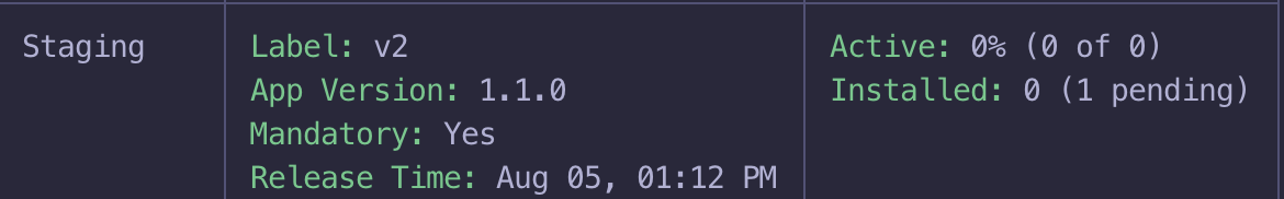 我发布了一个类似于codePush的版本:appcenter codepush release-react -a name/appName-1 -d Staging。这个命令成功了,我在iOS和Android的暂存环境中看到了正确的版本。