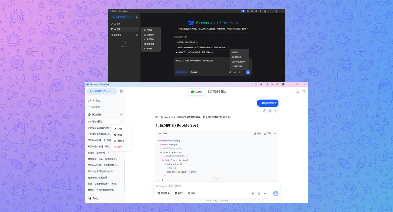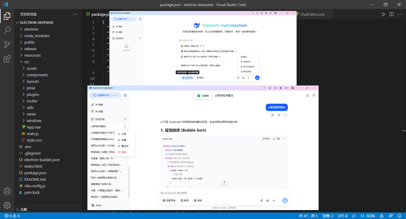从零开始:用electron41+vite8.0+Vue 3 + DeepSeek搭建一个支持流式输出的 AI 对话界面系统。